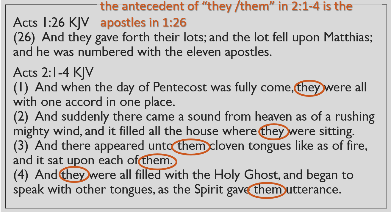 - Apostles speaking in tongues – actual human languages (glossa) which they had not previously studied - Acts 2:1-8